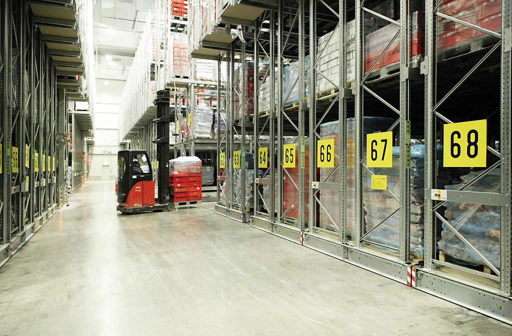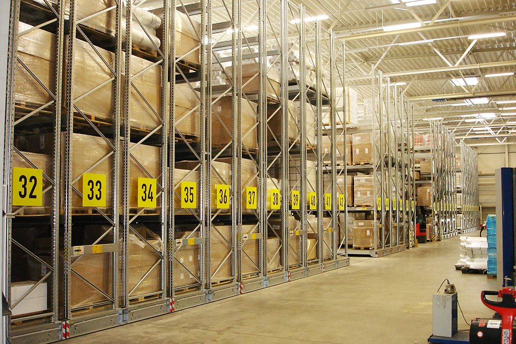 De tunge, elektrisk drevne mobile pallereolene, MOVO, går på skinner som er støpt ned i gulvet, og tåler belastninger på opp til 24 tonn pr fag, i opp til 12 m høye seksjoner.